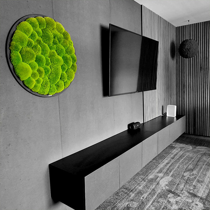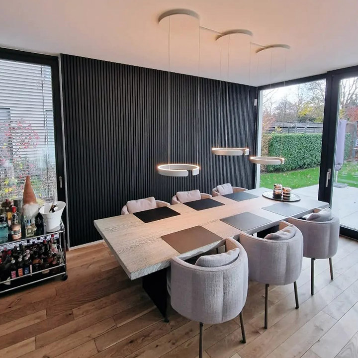 mineralische Betontapete und Akustikpaneele im Wohnzimmer